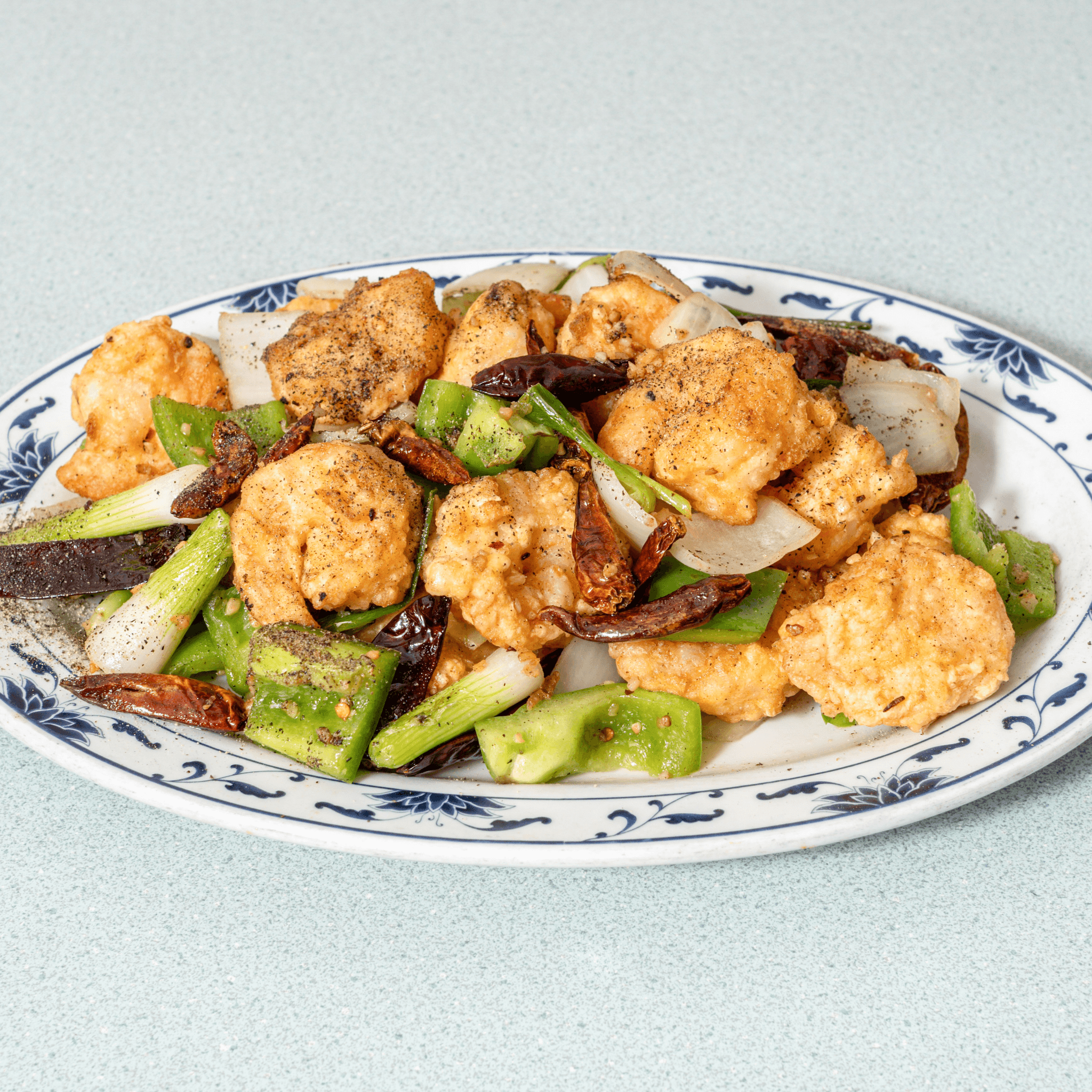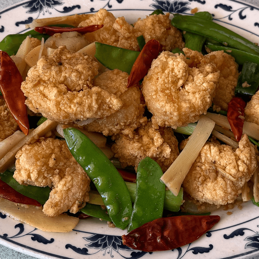 Hand-Battered Shrimp with Black Pepper, Green Pepper, Green Onions and Onions.