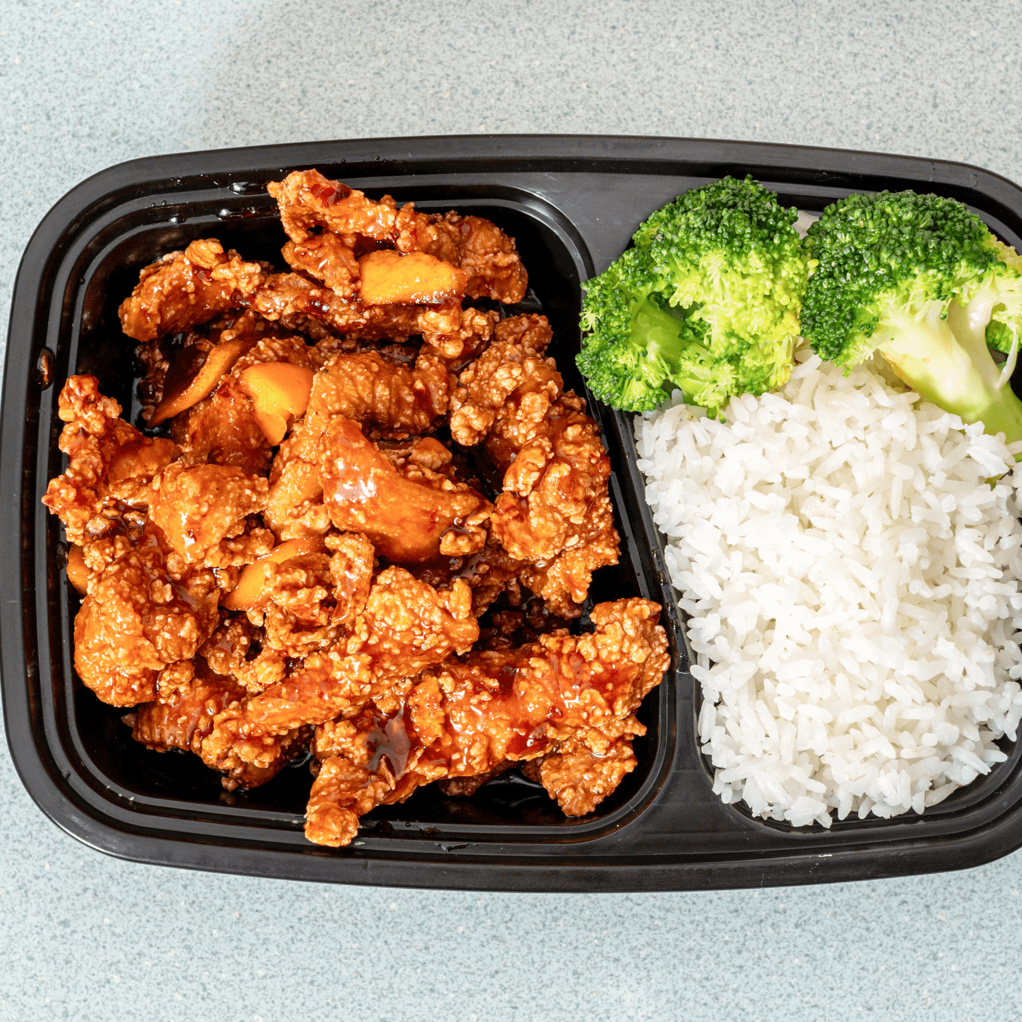 Sesame Chicken with Steamed Rice (or Fried rice + &1.00) & Broccoli.