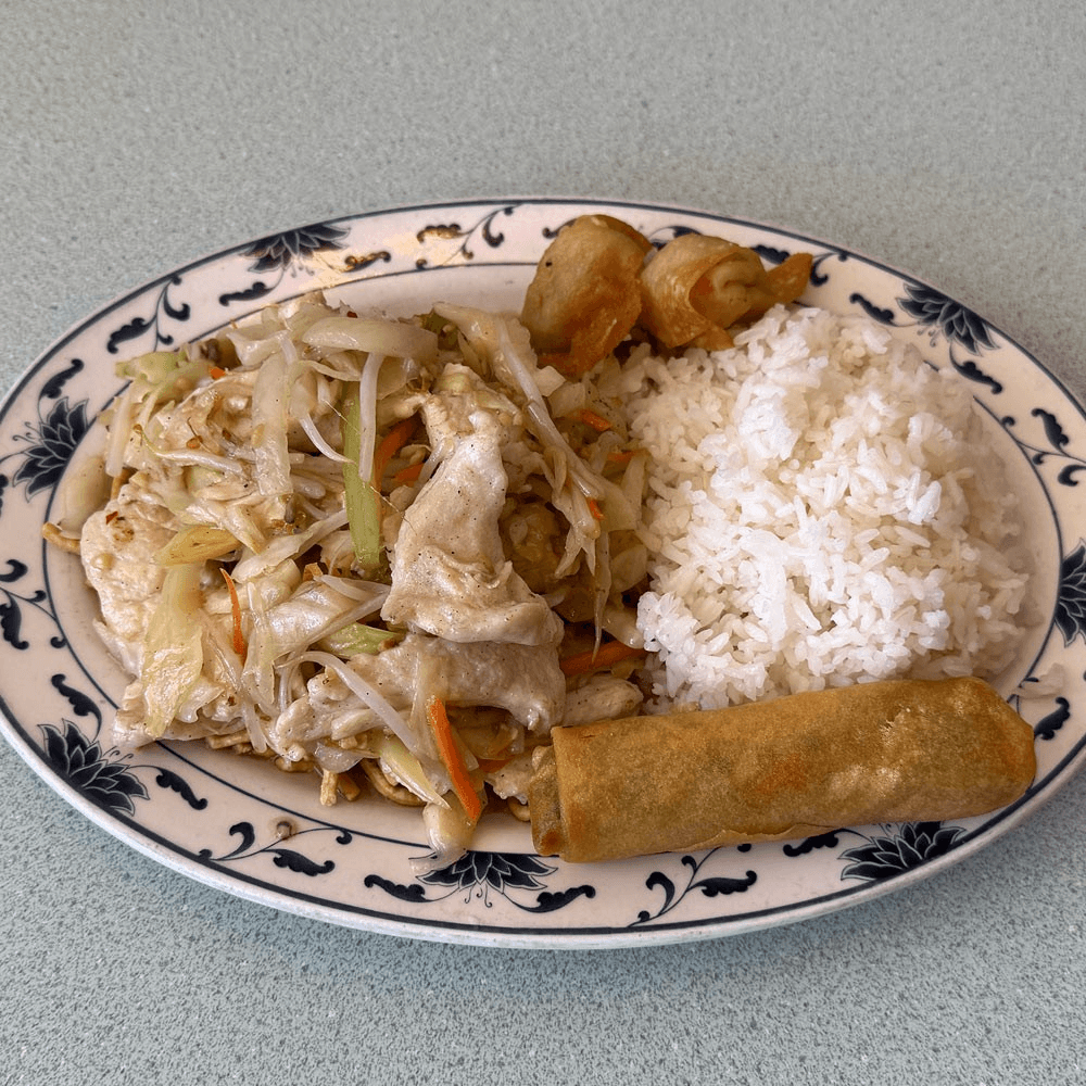 Chicken & veggies. Served with steamed rice or fried rice, egg spring roll, sweet & sour chicken (4) or crab rangoon (2), egg drop soup or hot & sour soup or won ton soup with additional price