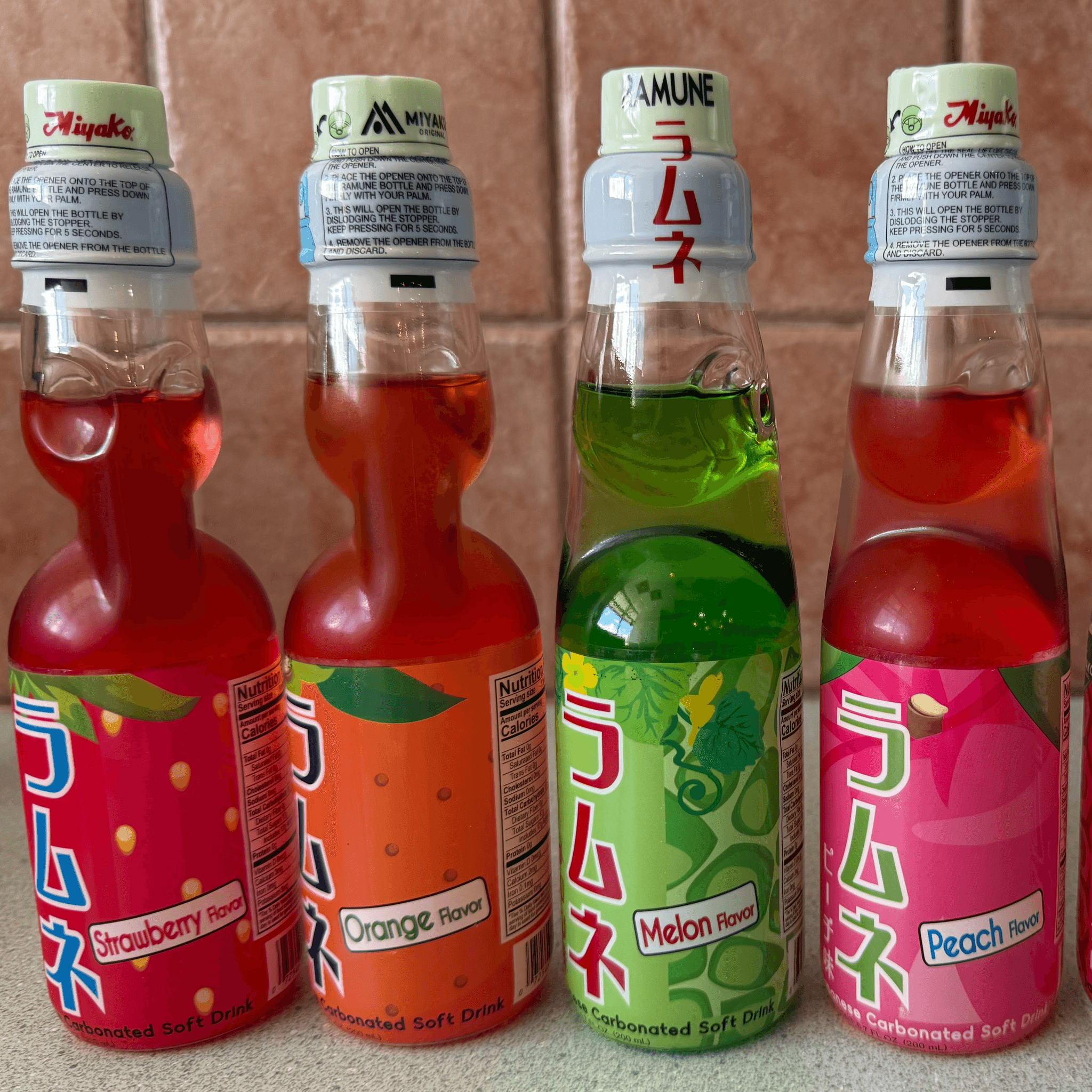 Ramune has 6 flavors: - Blue Hawaii' - Lychee - Melon - Orange - Peach - Strawberry