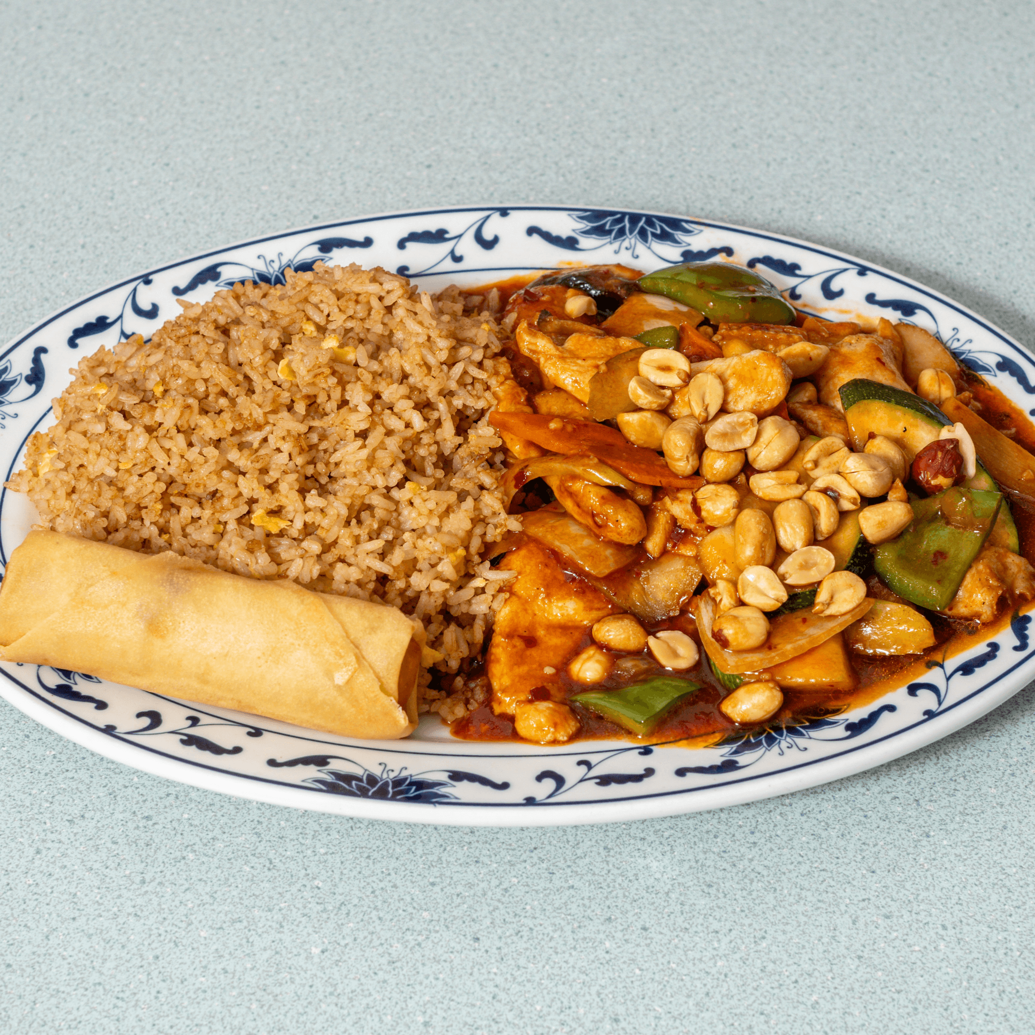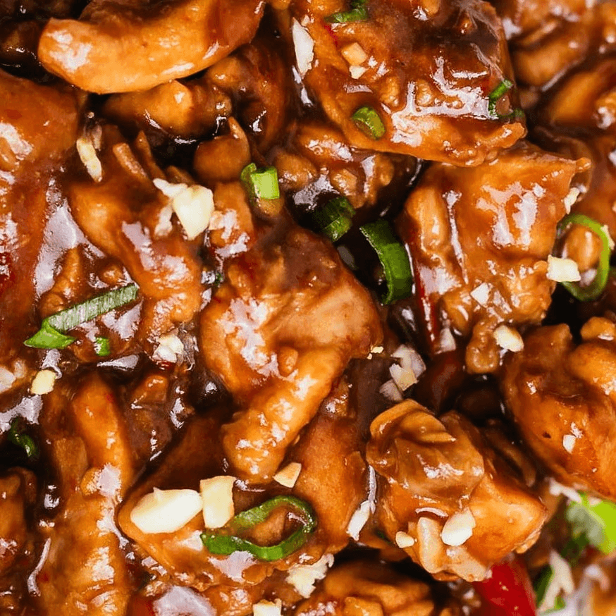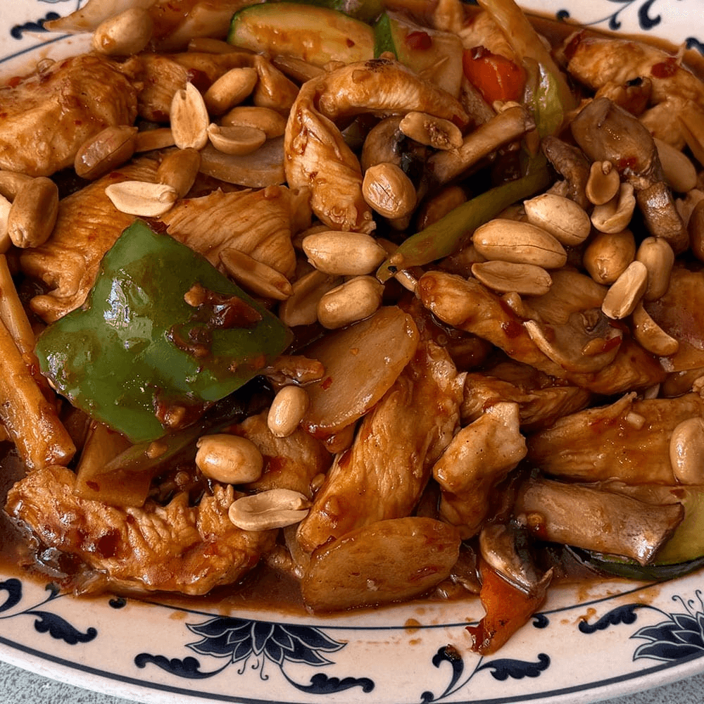 Slightly spicy and full of flavor, this dish combines tender chicken, crunchy peanuts, and veggies in a tangy, chili-infused sauce with a hint of sweetness.