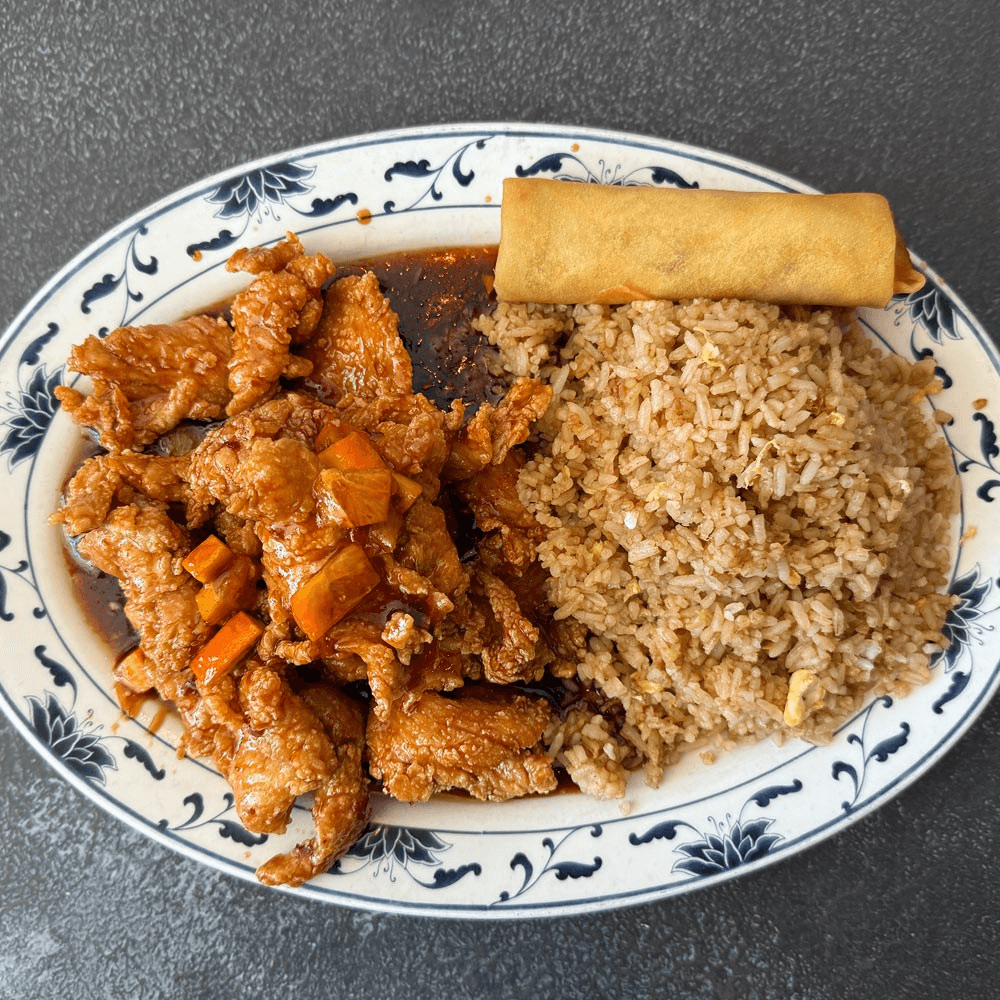 Served with steamed rice or fried rice, egg spring roll, sweet & sour chicken (4) or crab rangoon (2), egg drop soup or hot & sour soup or won ton soup with additional price