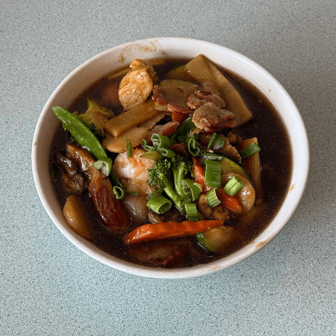 A hearty blend of shrimp, pork, chicken, tofu, and vegetables in a savory broth. A little bit of everything.