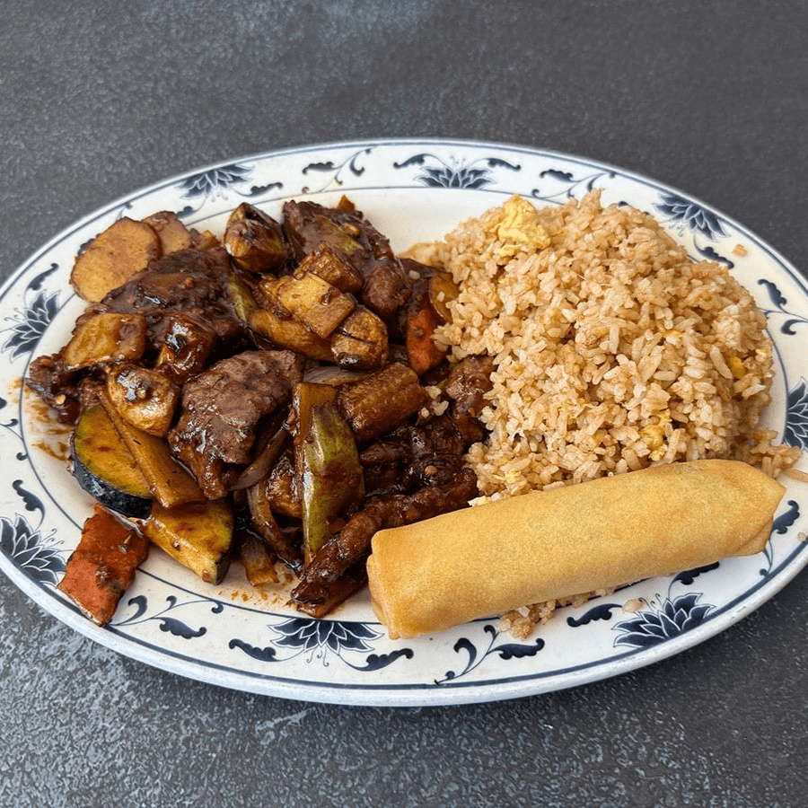 Slightly spicy. Served with steamed rice or fried rice, egg spring roll, sweet & sour chicken (4) or crab rangoon (2), egg drop soup or hot & sour soup or won ton soup with additional price