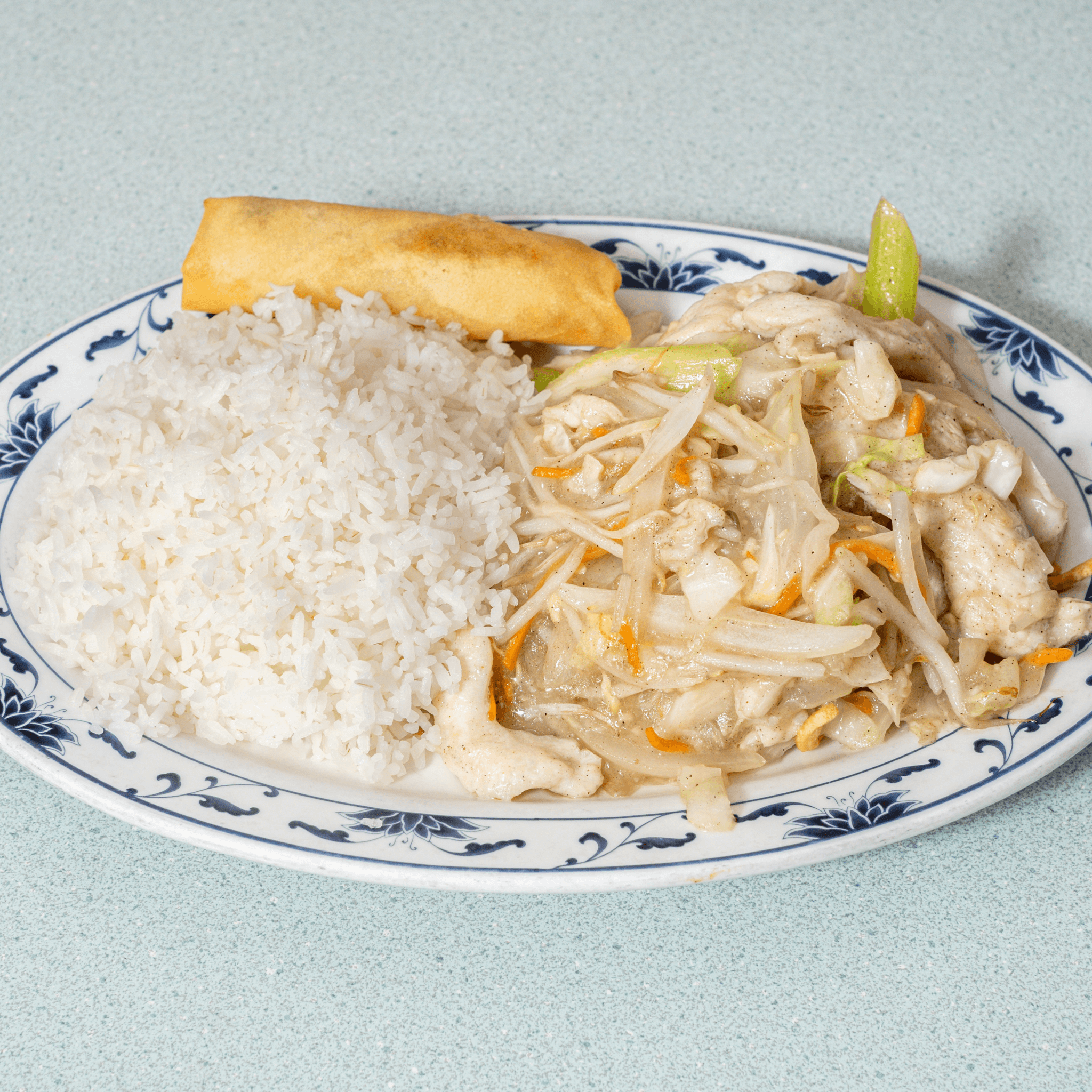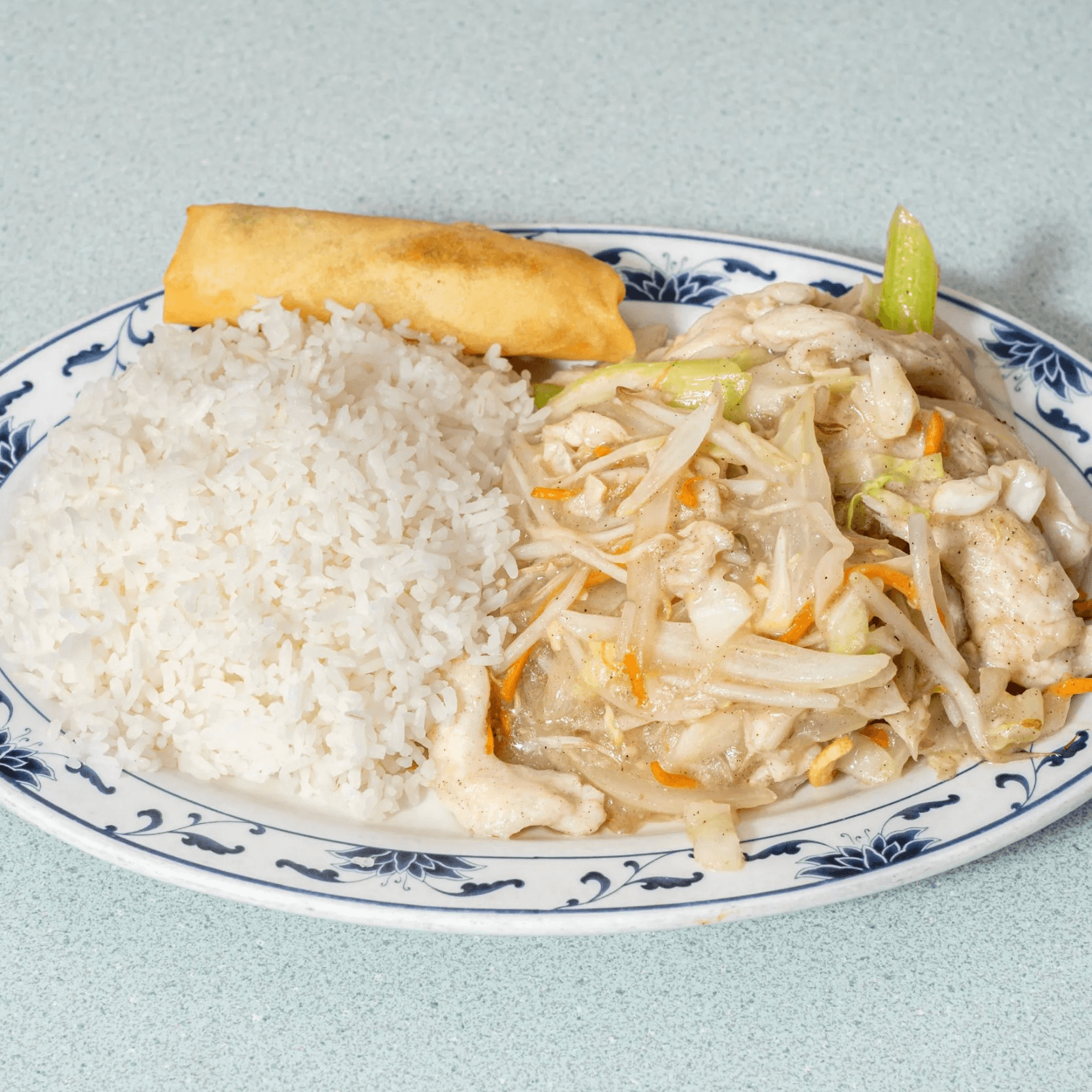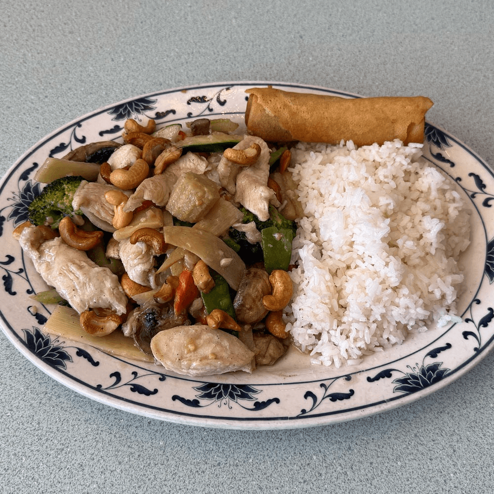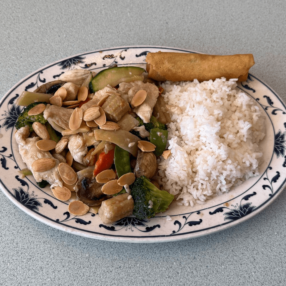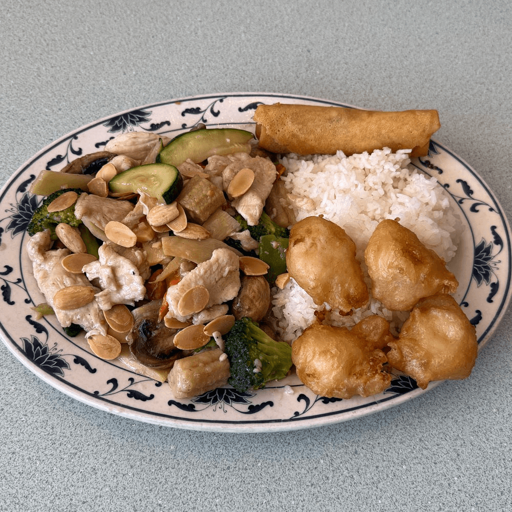 Chicken and vegetables in garlic white sauce, topped with slivered almonds. Light and nutty. Served with your choice of steamed or fried rice, sweet & sour chicken (4 pcs) or crab rangoon (2 pcs), one egg spring roll, and your choice of egg drop, hot & sour, or wonton soup for an additional charge.