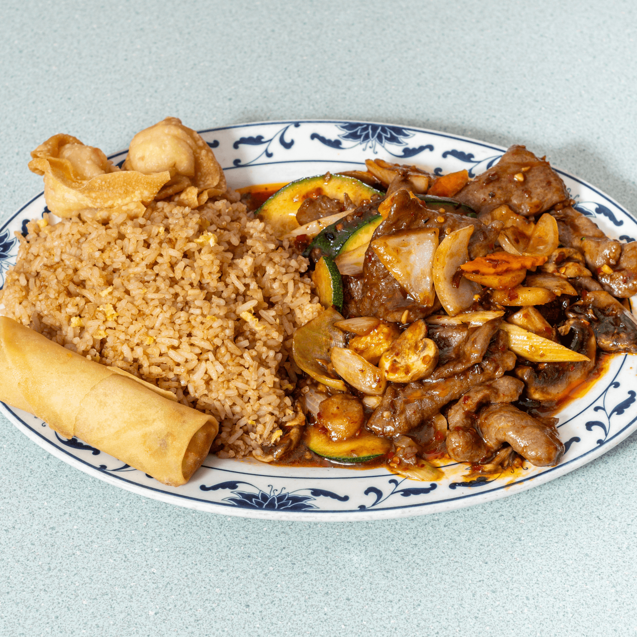 Protein has 4 options: Chicken, Beef, Tofu or Shrimp (+$1). Slightly spicy. Served with steamed rice or fried rice, egg spring roll, sweet & sour chicken (4) or crab rangoon (2), egg drop soup or hot & sour soup or won ton soup with additional price