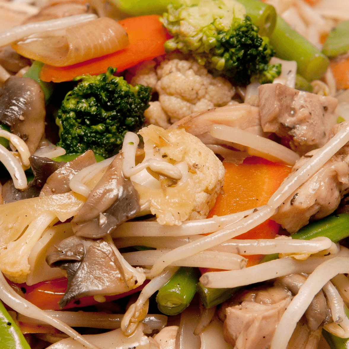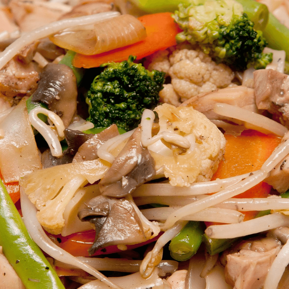 Soft, stir-fried noodles are tossed with your protein of choice and mixed vegetables in a rich, flavorful sauce. Shrimp available for $1 extra.