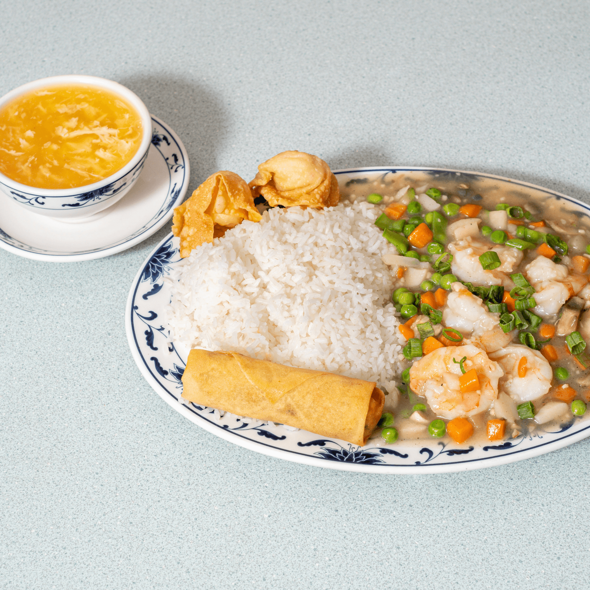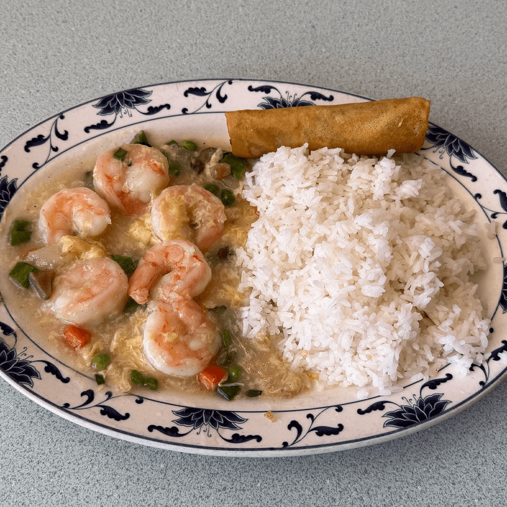 Protein has 2 options: Chicken or Shrimp (+$1). Slightly spicy. Served with steamed rice or fried rice, egg spring roll, sweet & sour chicken (4) or crab rangoon (2), egg drop soup or hot & sour soup or won ton soup with additional price