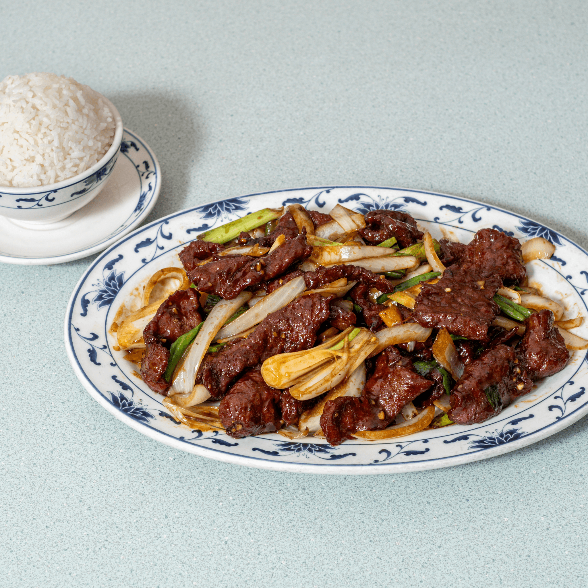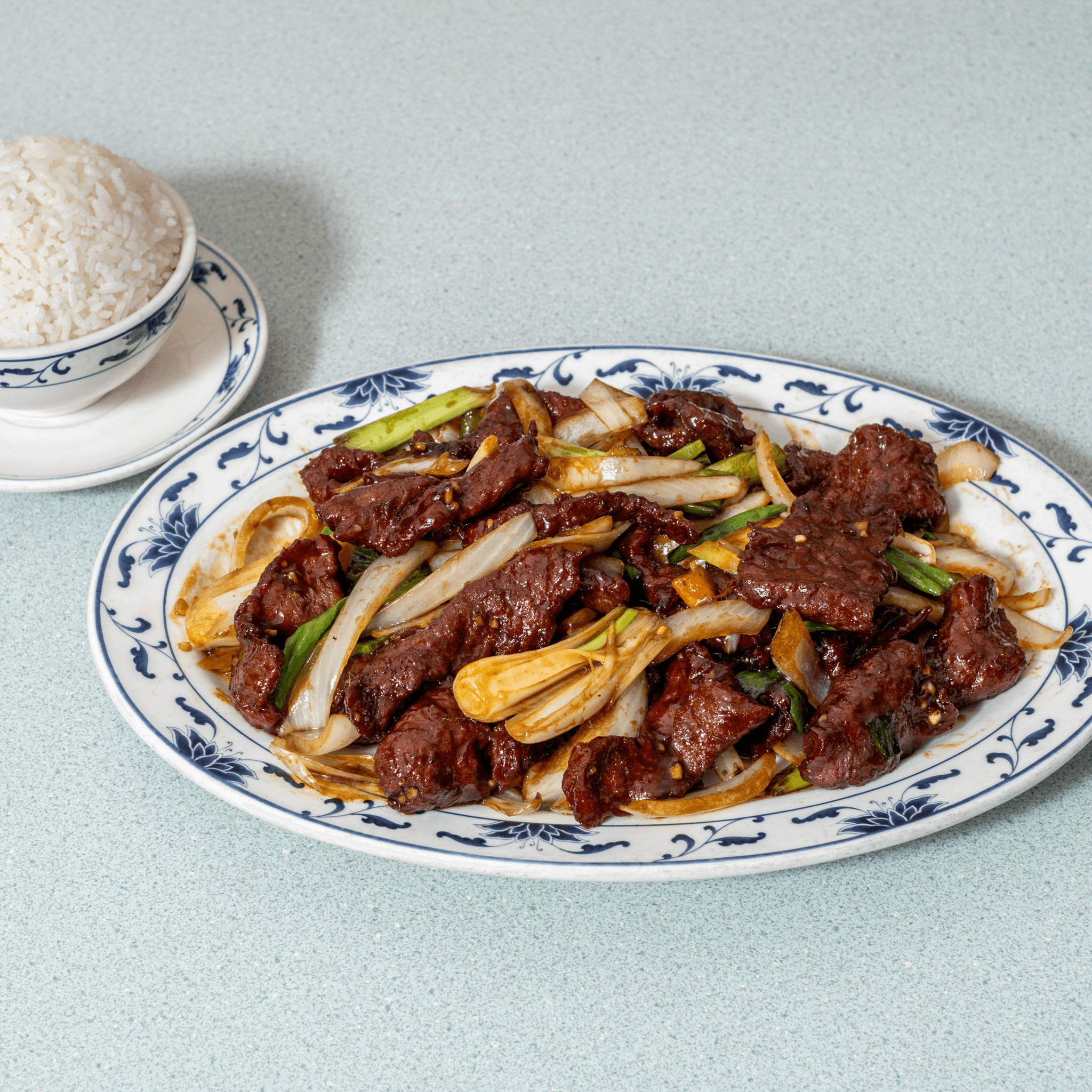 Slices of beef stir-fried with scallions and onions in a rich, slightly sweet Mongolian sauce. Bold, savory, and satisfying.