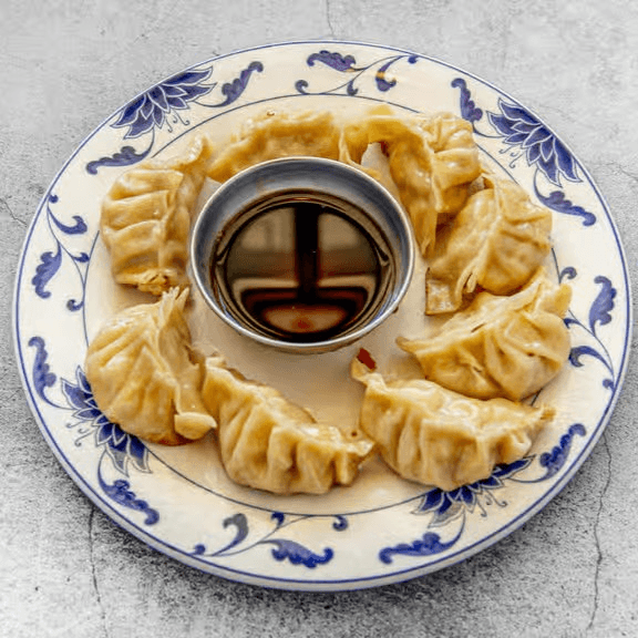 Pan-fried dumplings filled with seasoned ground chicken and cabbage. These six golden-brown potstickers are crispy on the bottom, tender on top, and delicious all around.