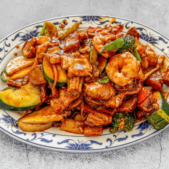 BBQ Pork, Tender Chicken & Shrimp over Pan Fried Noodles in Brown Sauce.
