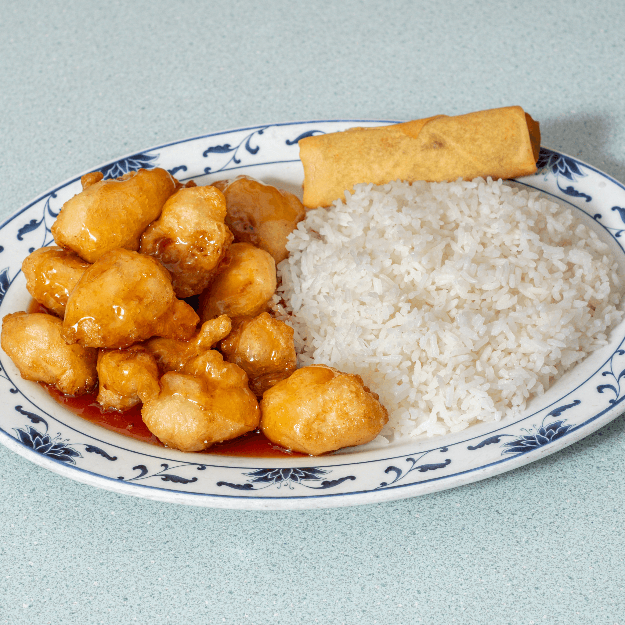 Chicken. Served with steamed rice or fried rice, egg spring roll, sweet & sour chicken (4) or crab rangoon (2), egg drop soup or hot & sour soup or won ton soup with additional price