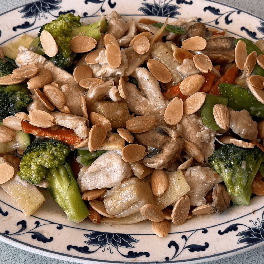 Plump shrimp stir-fried with vegetables in a light garlic white sauce and finished with slivered almonds. Elegant, clean, and mildly nutty. (Almond Chicken pictured)